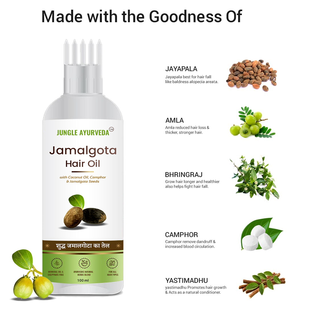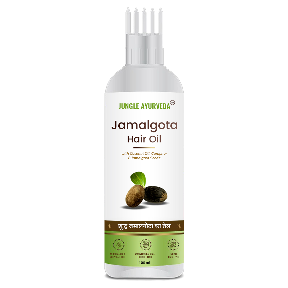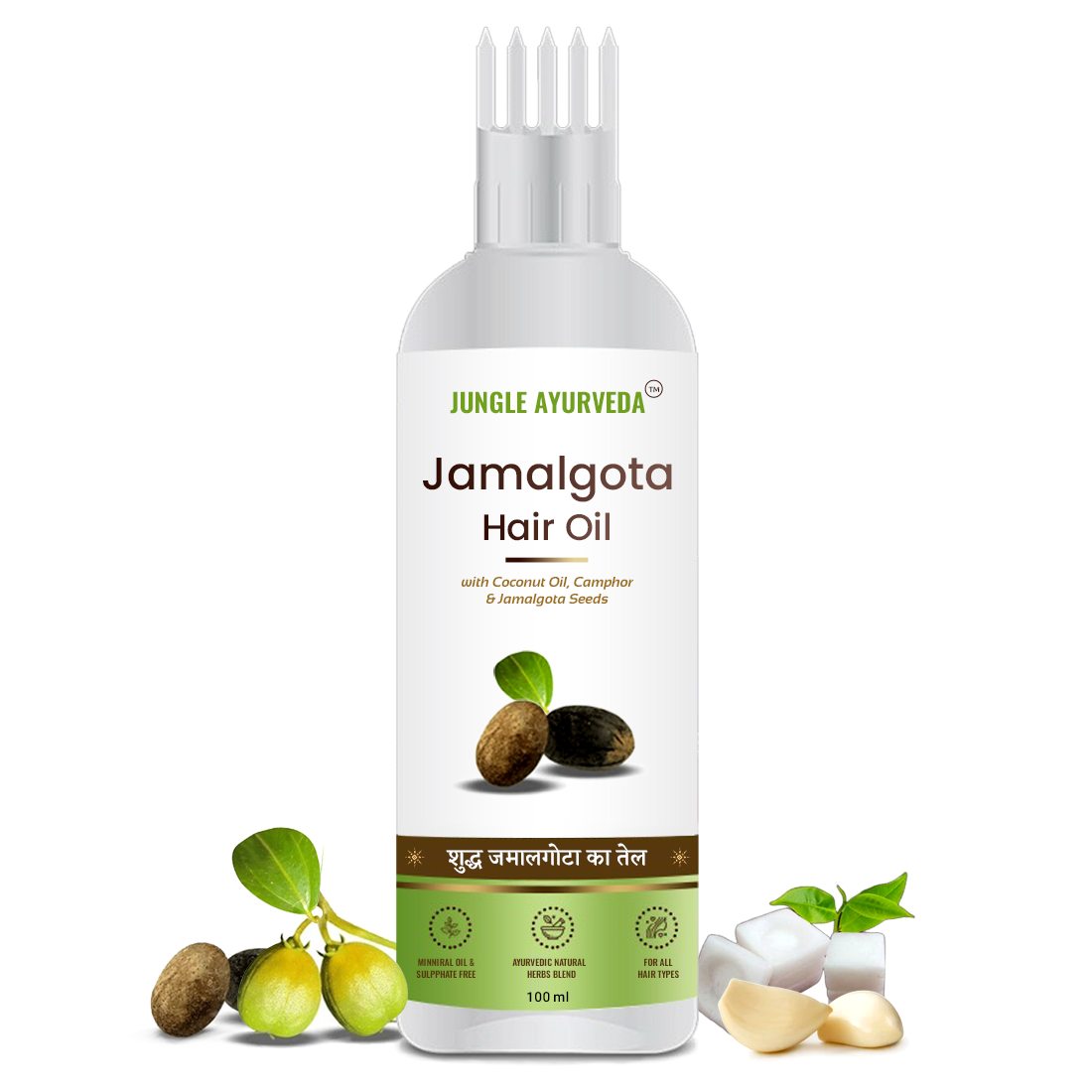 Jamalgota ayurvedic oil is a proprietary Ayurvedic hair oil for hair fall reduction. Purified jamalgota seed extracts have been added to each bottle of jamalghota ayurvedic oil to help reduce hair fall. Jamalgota hair oil is even more potent because it is made with 6 Herbs and Essential Oil. It also includes herbs like Camphor, Garlic, Shikakai, Tulsi, and Amla, which are known to be rich sources of antioxidants, minerals, micronutrients, and vitamins.