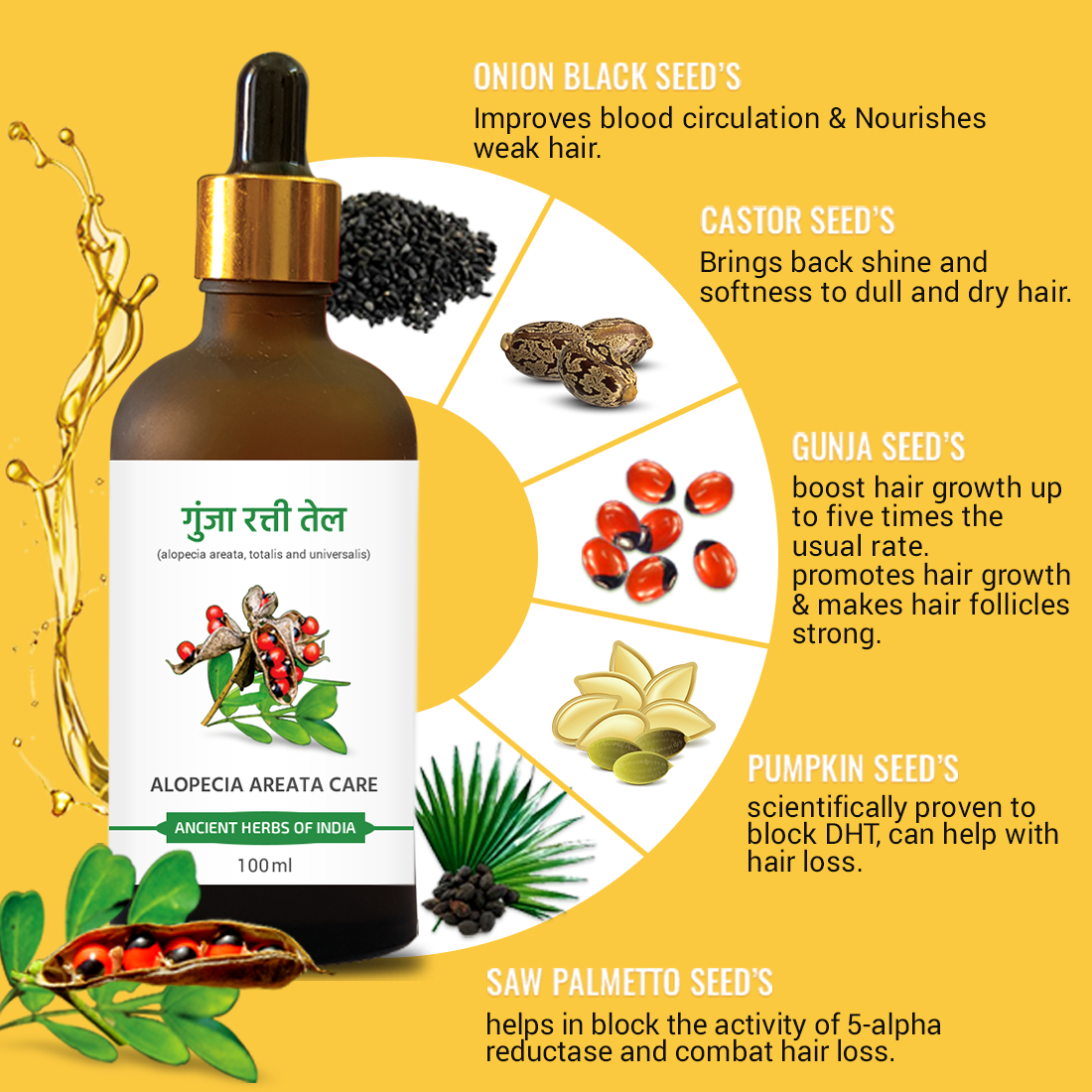 Ayurvedic Gunja Hair Oil for Alopecia Areata & Scalp Therapy, Anti-Fungal Hair Oil, Helps in Ringworm, Alopecia Areata. Gunja Ratti Oil is a safe, effective and natural external Oil for symptoms such as Alopecia Areata and Hair Loss Problem.